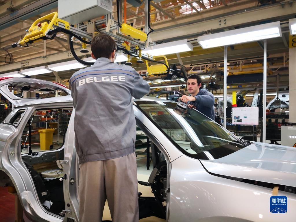 這是2018年12月1日在白俄羅斯首都明斯克東北方向50公里處的白俄羅斯吉利全散件汽車制造廠總裝車間拍攝的工人組裝車體。新華社記者 張若玄 攝