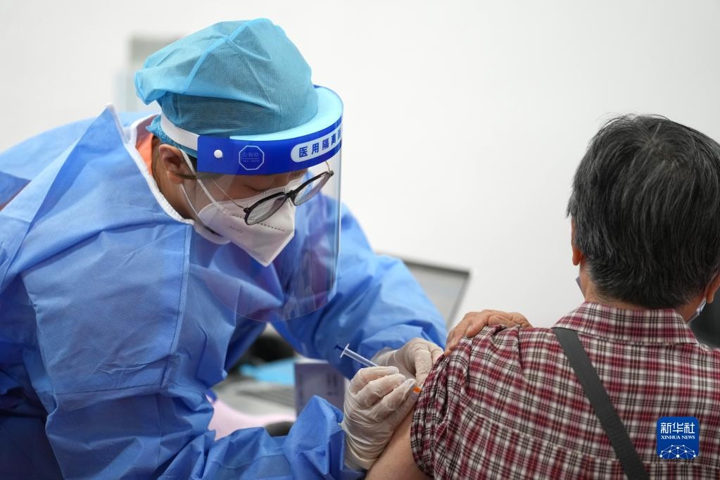 2022年7月13日,在北京市朝陽(yáng)區(qū)奧運(yùn)村街道一處新冠疫苗接種點(diǎn),醫(yī)護(hù)人員為一名86歲的市民接種新冠疫苗加強(qiáng)針。新華社記者 鞠煥宗 攝
