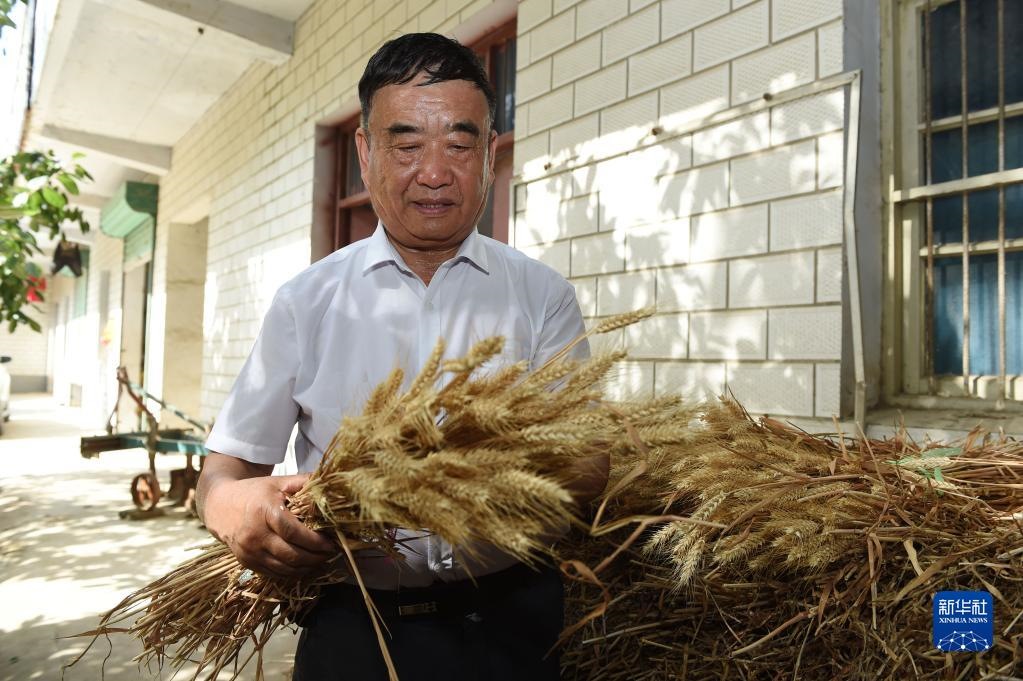 2022年6月28日,徐淙祥在安徽太和縣淙祥現(xiàn)代農(nóng)業(yè)種植專業(yè)合作社察看小麥樣品。新華社記者 周牧 攝