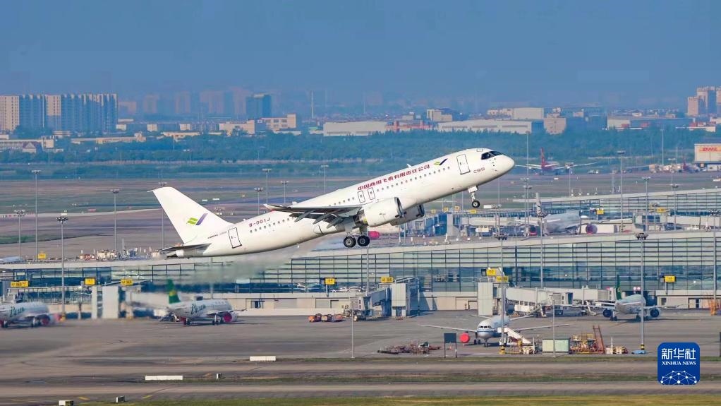 2022年5月14日6時(shí)52分,編號(hào)為B-001J的C919大飛機(jī)從上海浦東機(jī)場(chǎng)第4跑道起飛,于9時(shí)54分安全降落,標(biāo)志著中國(guó)商飛公司即將交付首家用戶的首架C919大飛機(jī)首次飛行試驗(yàn)圓滿完成。新華社發(fā)