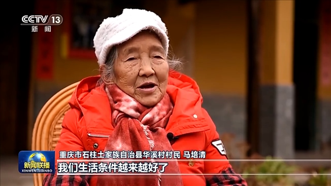 重慶市石柱土家族自治縣華溪村村民 馬培清:我們生活條件越來越好了,不愁吃、不愁穿。我們住的房子也寬敞了,一家大小吃的自來水干干凈凈的。現(xiàn)在我們的生活條件發(fā)生的變化是習總書記給我們帶來的,非常高興。