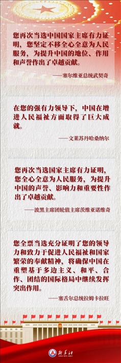 塞爾維亞總統(tǒng)武契奇表示,您再次當(dāng)選中國國家主席有力證明,您堅定不移全心全意為人民服務(wù),為提升中國的地位、作用和聲譽(yù)作出了卓越貢獻(xiàn)。