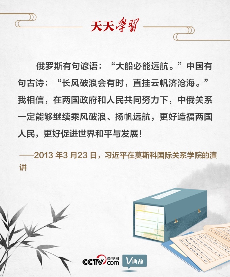 關(guān)于中俄關(guān)系,早在10年前在莫斯科國(guó)際關(guān)系學(xué)院的演講中,習(xí)近平主席就有精辟闡述。演講結(jié)束語(yǔ)中,習(xí)主席首先引用一句俄羅斯諺語(yǔ)“大船必能遠(yuǎn)航”,拉近了與俄羅斯民眾的文化空間和心理距離。接著引用了含義相近的中國(guó)古詩(shī)“長(zhǎng)風(fēng)破浪會(huì)有時(shí),直掛云帆濟(jì)滄?!?,讓對(duì)方在文化相似性中深刻領(lǐng)悟其中道理。最后凝聚共同理念:“中俄關(guān)系一定能夠繼續(xù)乘風(fēng)破浪、揚(yáng)帆遠(yuǎn)航”。