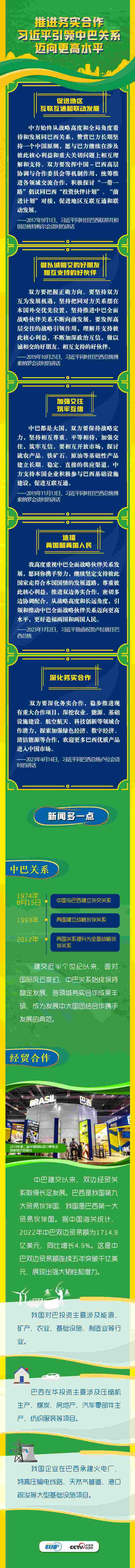 中國和巴西分別是東西半球最大的發(fā)展中國家和重要新興市場國家,互為全面戰(zhàn)略伙伴,擁有廣泛共同利益。習(xí)近平主席曾多次對中巴關(guān)系表達(dá)“聚焦共同發(fā)展,促進(jìn)務(wù)實(shí)合作”的期望。央視網(wǎng)《聯(lián)播+》梳理相關(guān)內(nèi)容,與您一起學(xué)習(xí)。