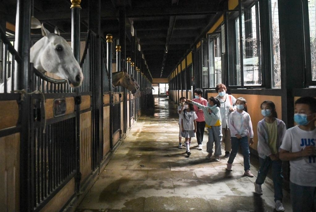 在新疆古生態(tài)園汗血馬基地,幾名小朋友在導游的介紹下觀察汗血馬(2022年6月16日攝)。新華社記者 王菲 攝