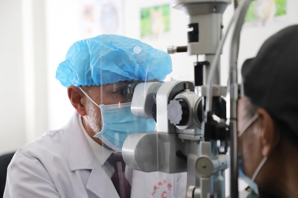 卡培拉別科夫為患者檢查雙眼(2020年4月11日攝)。新華社記者 徐凱鑫 攝