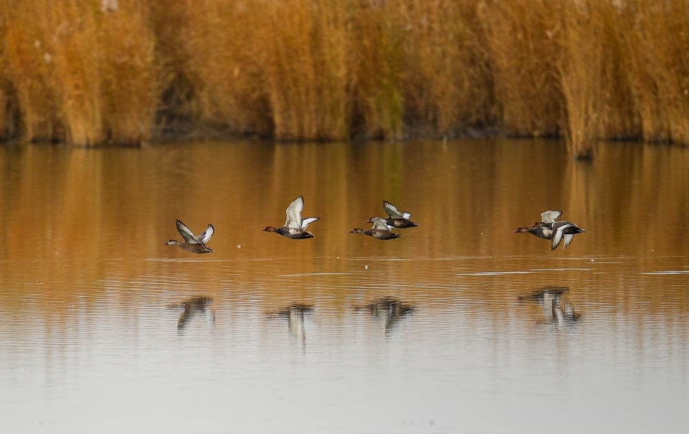 2020年11月15日,幾只天鵝飛翔在烏梁素海上空。