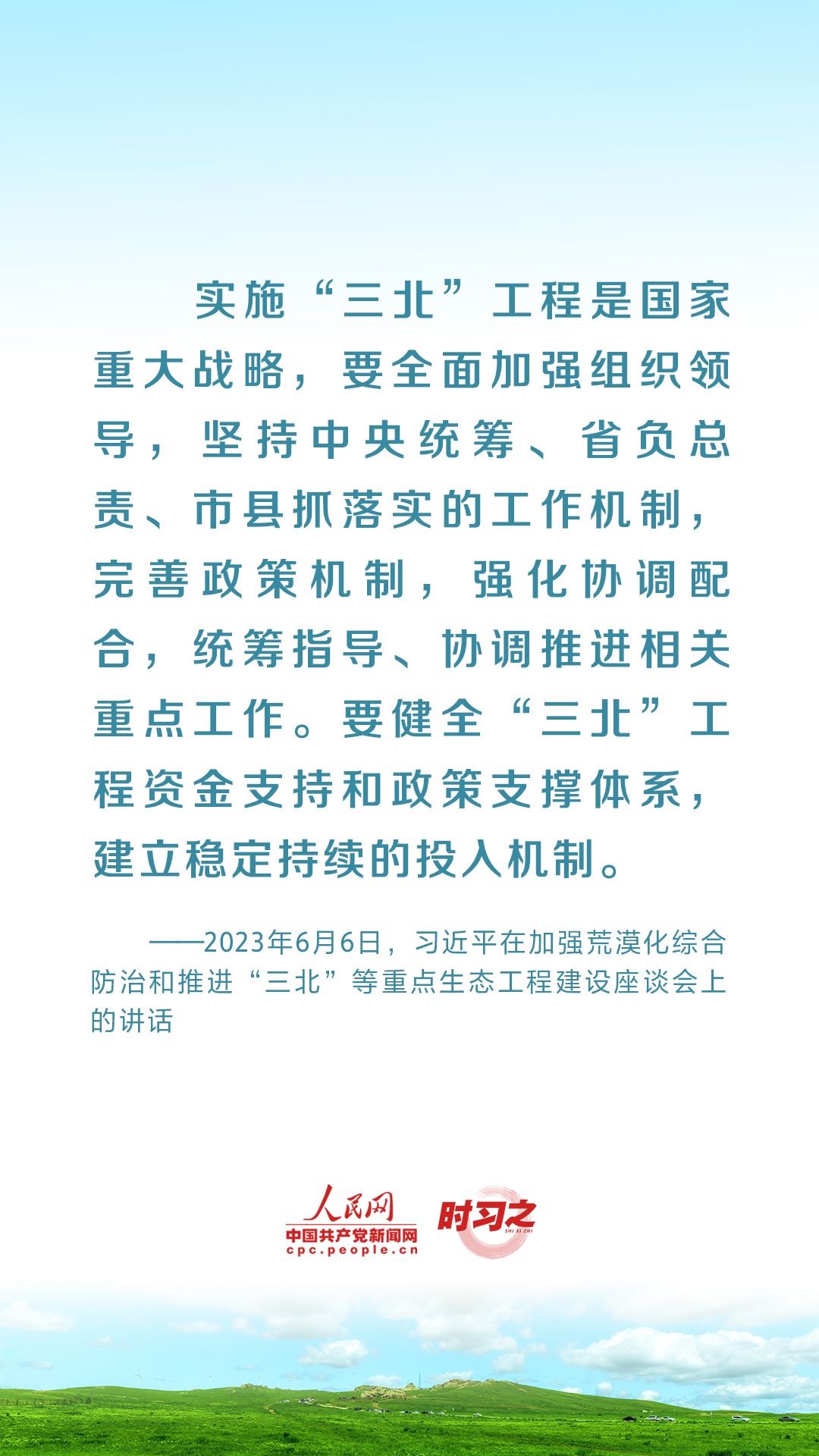 2023年6月5日至6日,中共中央總書記、國(guó)家主席、中央軍委主席習(xí)近平在內(nèi)蒙古自治區(qū)巴彥淖爾市考察,主持召開加強(qiáng)荒漠化綜合防治和推進(jìn)“三北”等重點(diǎn)生態(tài)工程建設(shè)座談會(huì)并發(fā)表重要講話。座談會(huì)上,習(xí)近平對(duì)走好中國(guó)特色防沙治沙道路提出工作要求。