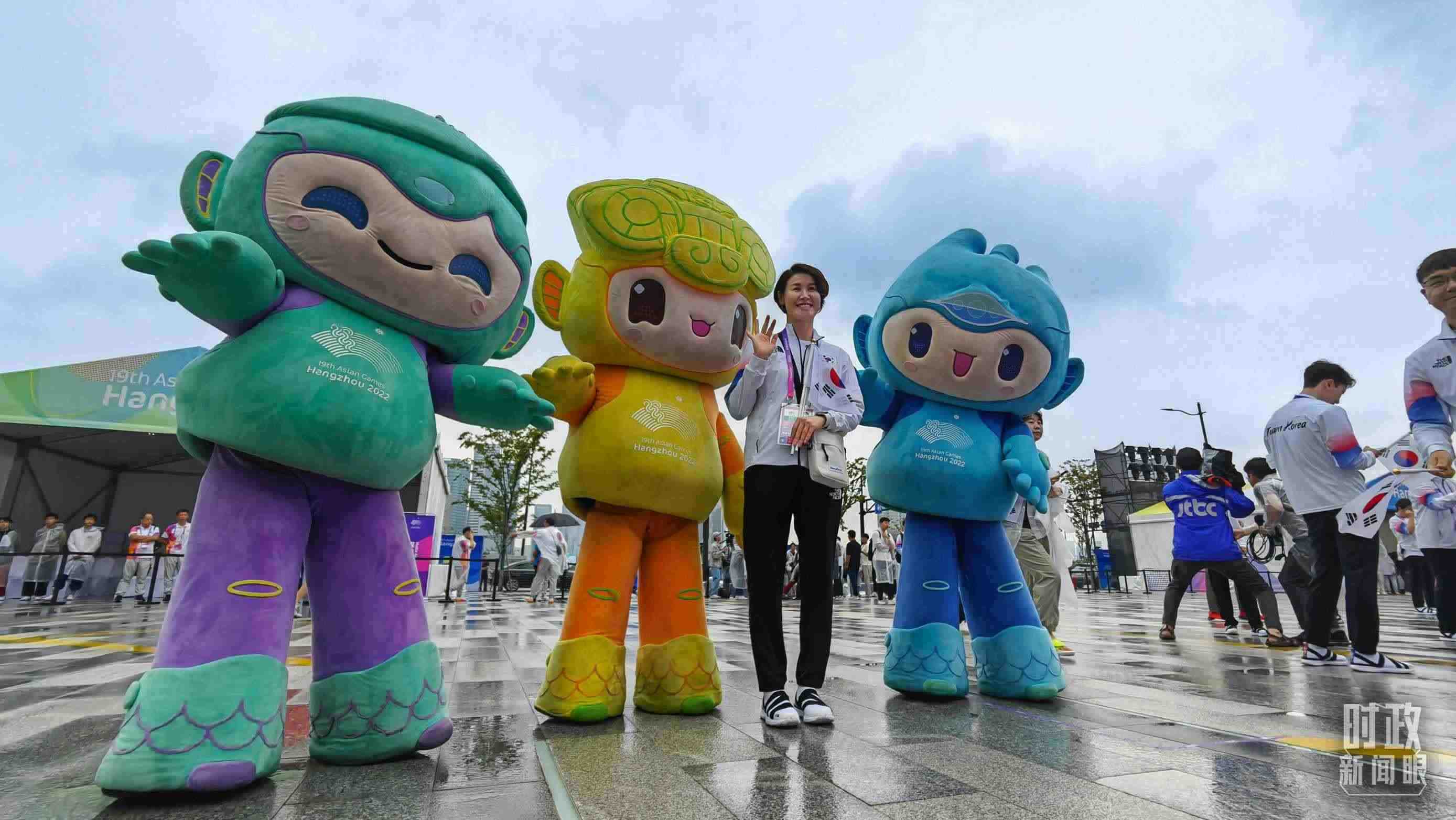 △亞運(yùn)村為各代表團(tuán)舉行歡迎儀式,隊(duì)員們紛紛與吉祥物“蓮蓮”、“琮琮”、“宸宸”合影。(總臺(tái)央視記者陳偉奎拍攝)