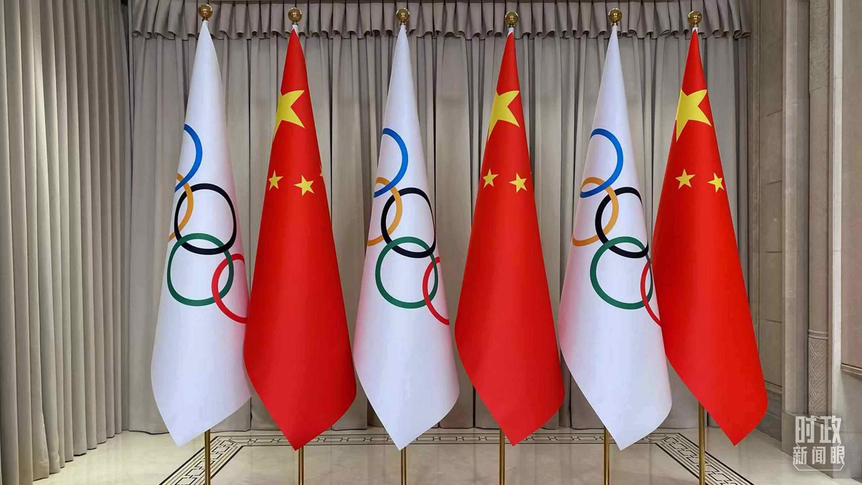 △會(huì)見現(xiàn)場(chǎng)擺放的中國國旗和奧林匹克會(huì)旗。(總臺(tái)央視記者李增仁拍攝)