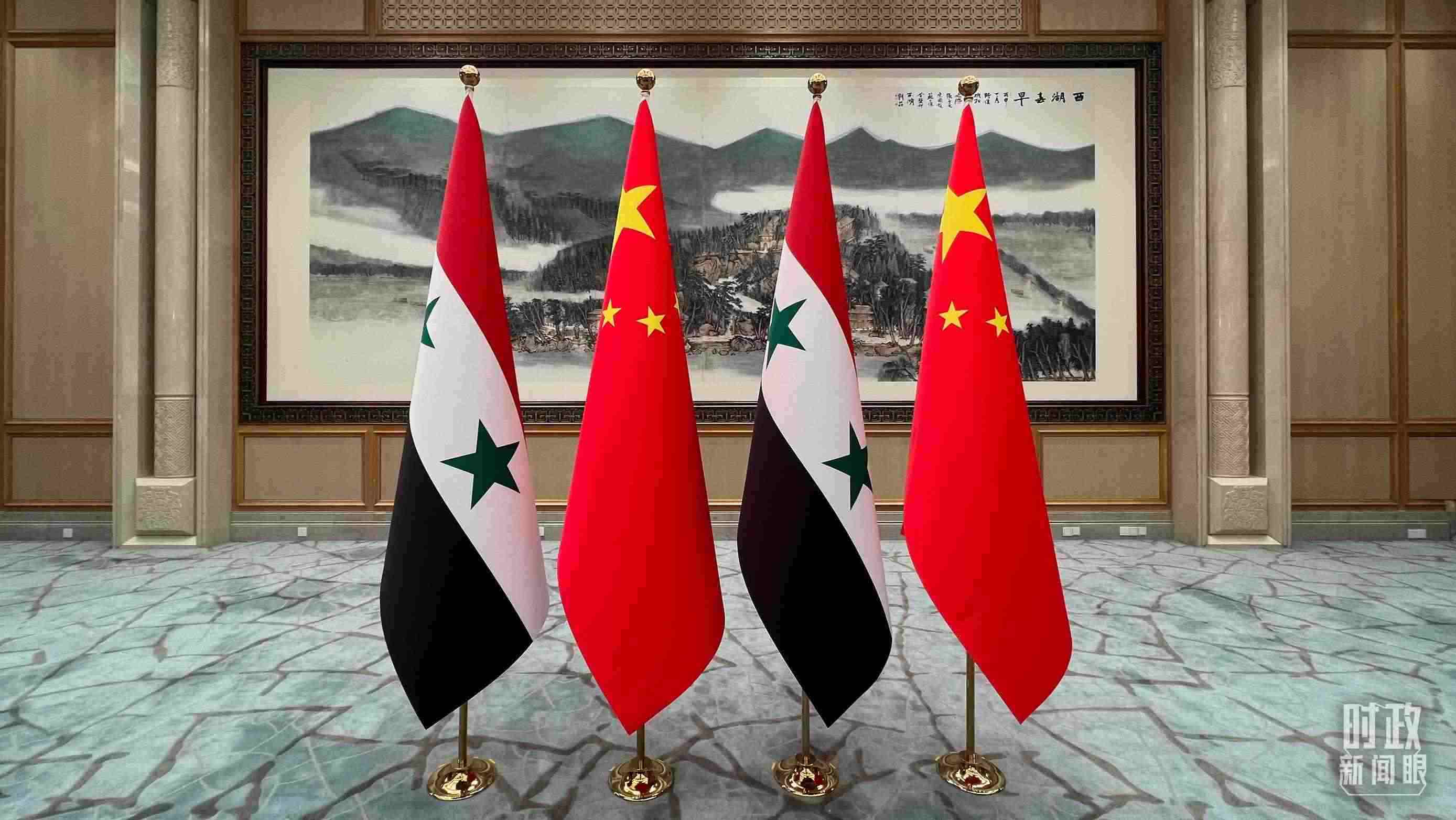 △會(huì)見現(xiàn)場(chǎng)擺放的中國、敘利亞國旗。(總臺(tái)央視記者程鋮拍攝)