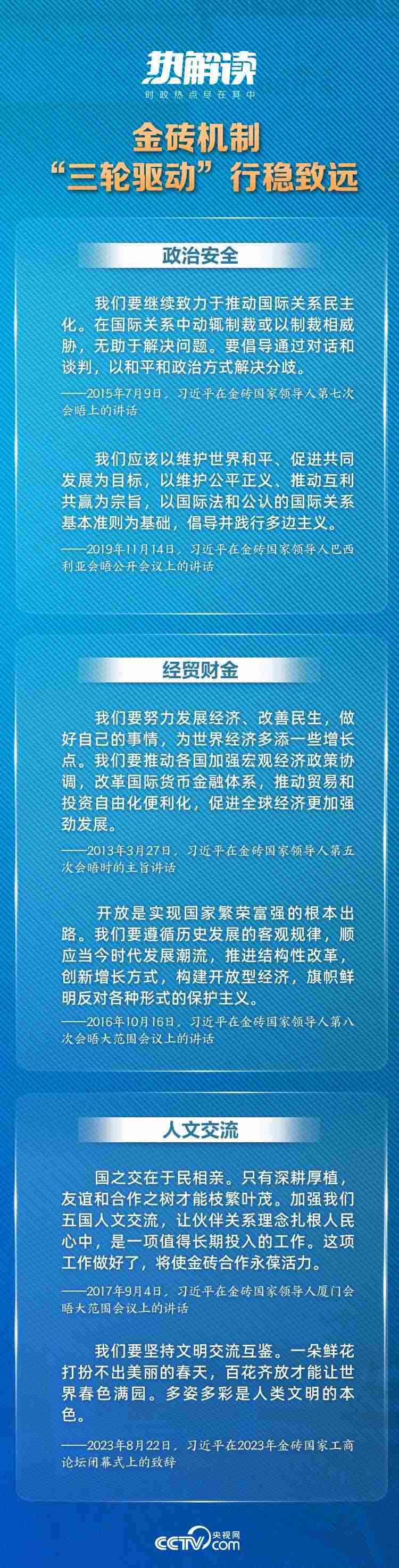 多年來(lái),習(xí)主席一次次為完善金磚國(guó)家“三輪驅(qū)動(dòng)”合作架構(gòu)架梁立柱,為解決全球性挑戰(zhàn)提供中國(guó)方案,為推動(dòng)全球公平公正發(fā)展貢獻(xiàn)中國(guó)智慧,在金磚發(fā)展之路上留下濃墨重彩的中國(guó)印記。