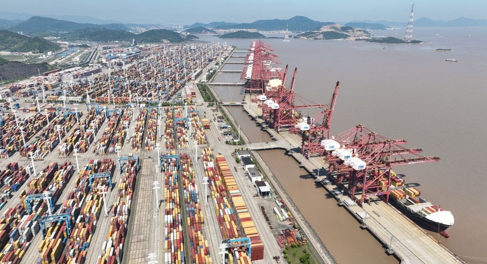 貨輪停靠在寧波舟山港穿山港區(qū)裝卸貨物(2023年5月9日攝,無(wú)人機(jī)照片)。新華社記者 翁忻旸 攝