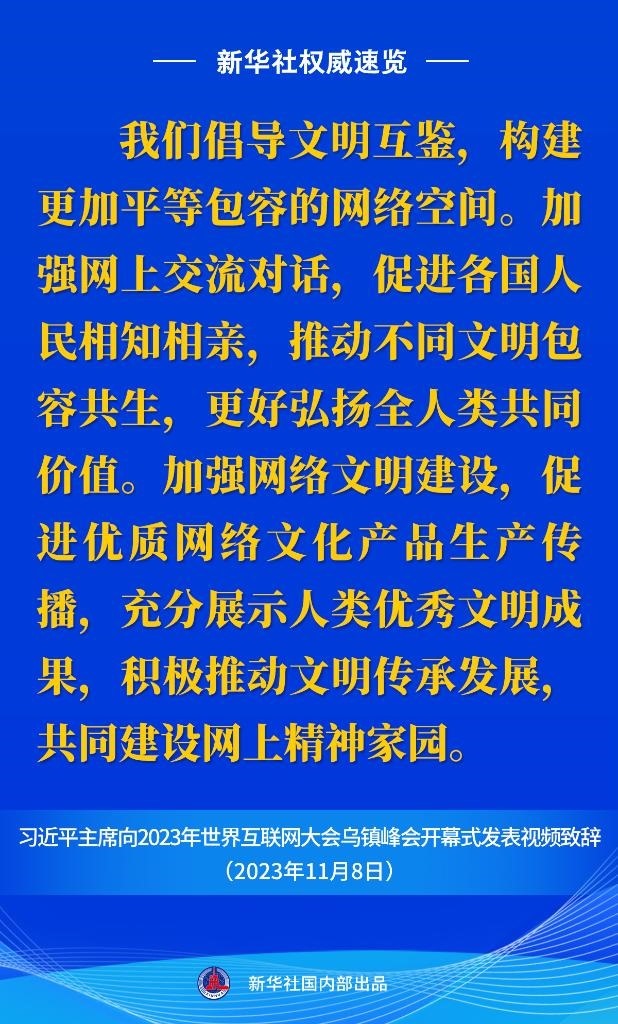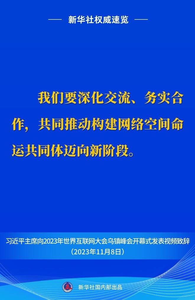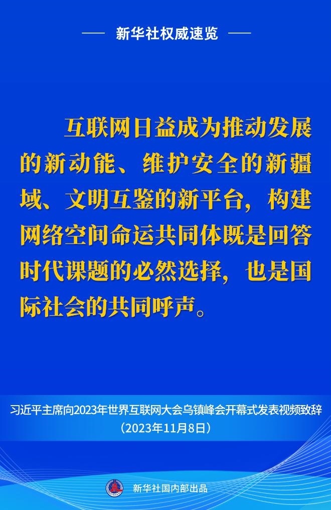 11月8日上午,國(guó)家主席習(xí)近平向2023年世界互聯(lián)網(wǎng)大會(huì)烏鎮(zhèn)峰會(huì)開(kāi)幕式發(fā)表視頻致辭。一起來(lái)看金句。