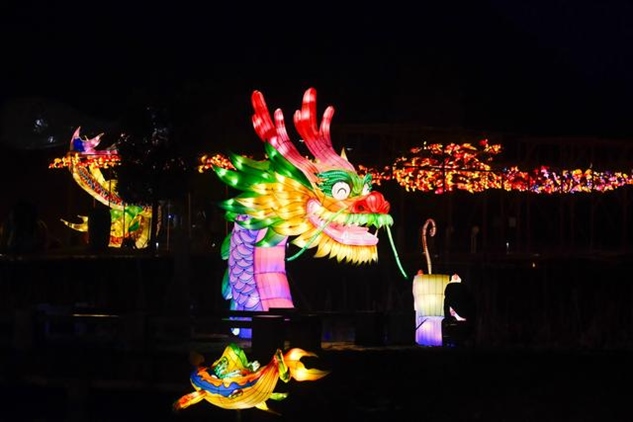 同樣迎來2024年龍年新春燈會的,還有湖北省恩施州宣恩縣城,這里的龍?jiān)煨蜔艚M格外亮眼,特別是其中一條非常壯觀的“貢水游龍”,龍身由30多只竹筏串聯(lián)而成,總長度達(dá)到200多米。游客還可以登上龍船觀燈展、賞夜色。隨著金色的巨龍?jiān)诒趟序暄延蝿?,也傳遞著吉祥的寓意。