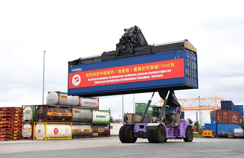 2022年7月11日,中歐班列(重慶)第10000列重箱折列抵達(dá)德國(guó)杜伊斯堡,這是接車儀式現(xiàn)場(chǎng)。