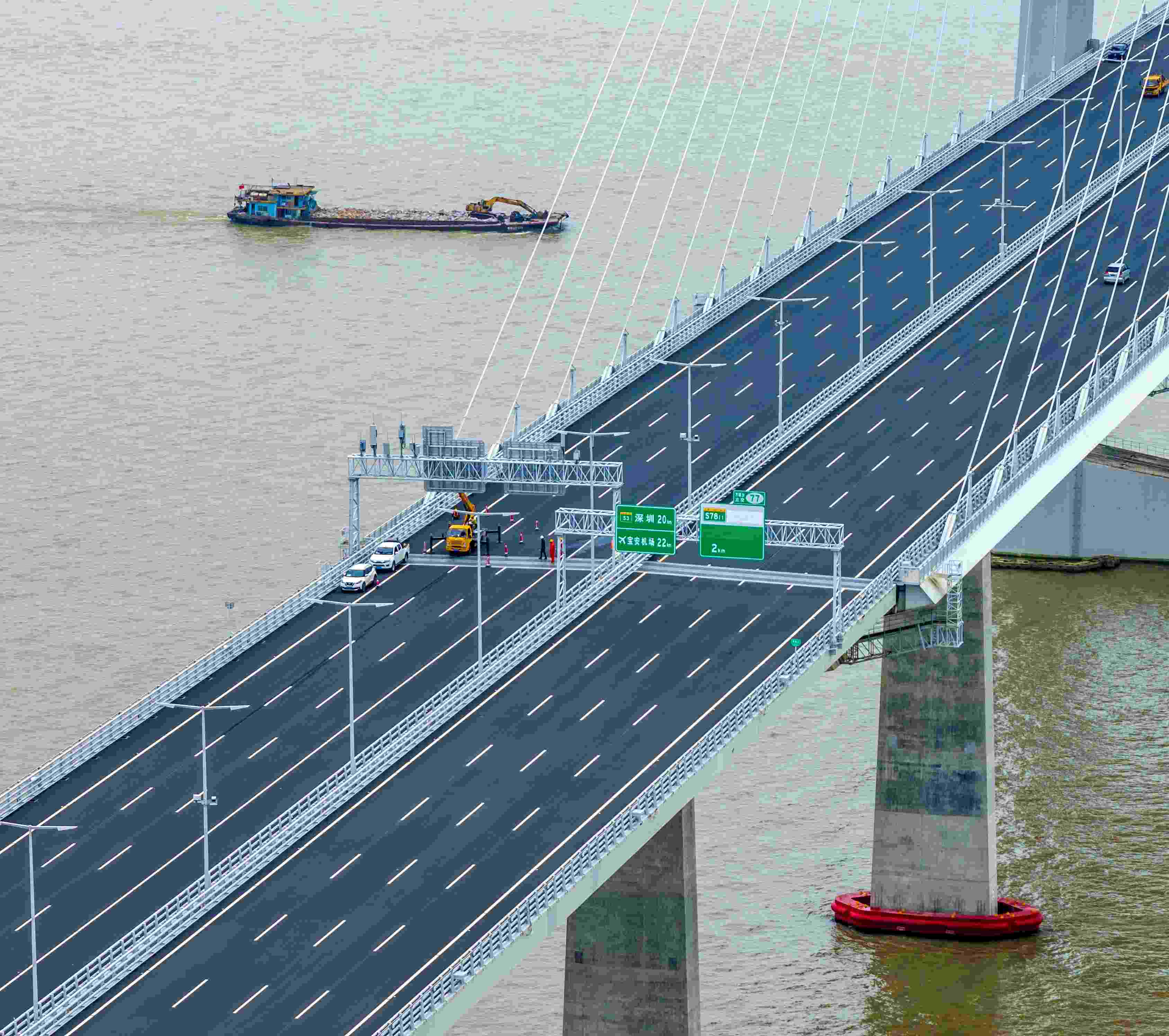 △2024年6月30日,深圳至中山跨江通道建成開(kāi)通。這是通車前工人在做最后的檢修和裝飾。
