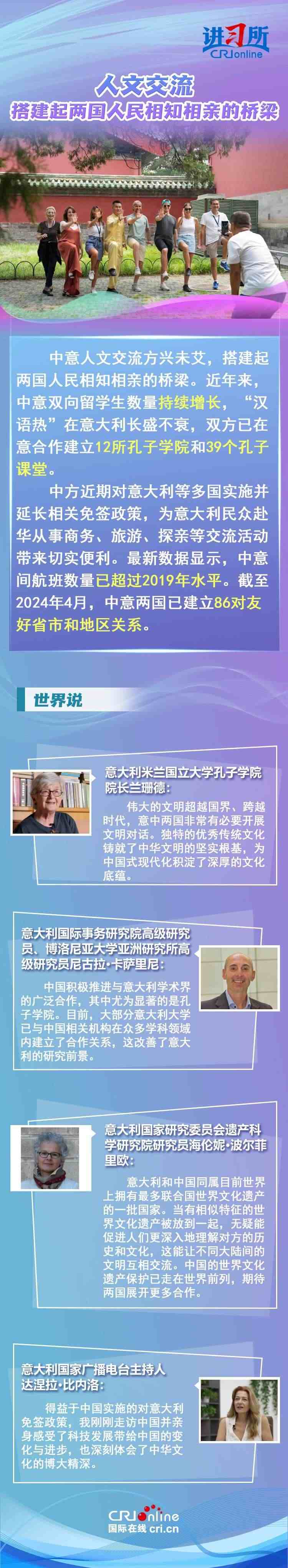 梅洛尼表示,中國對意大利而言是一個極為重要的經(jīng)貿(mào)和文化合作伙伴。意大利各界人士認為,中意并肩同行會創(chuàng)造更多的經(jīng)濟奇跡,同時兩國非常有必要開展文明對話,期待未來兩國展開更多領(lǐng)域合作,開啟全面戰(zhàn)略伙伴關(guān)系新階段。