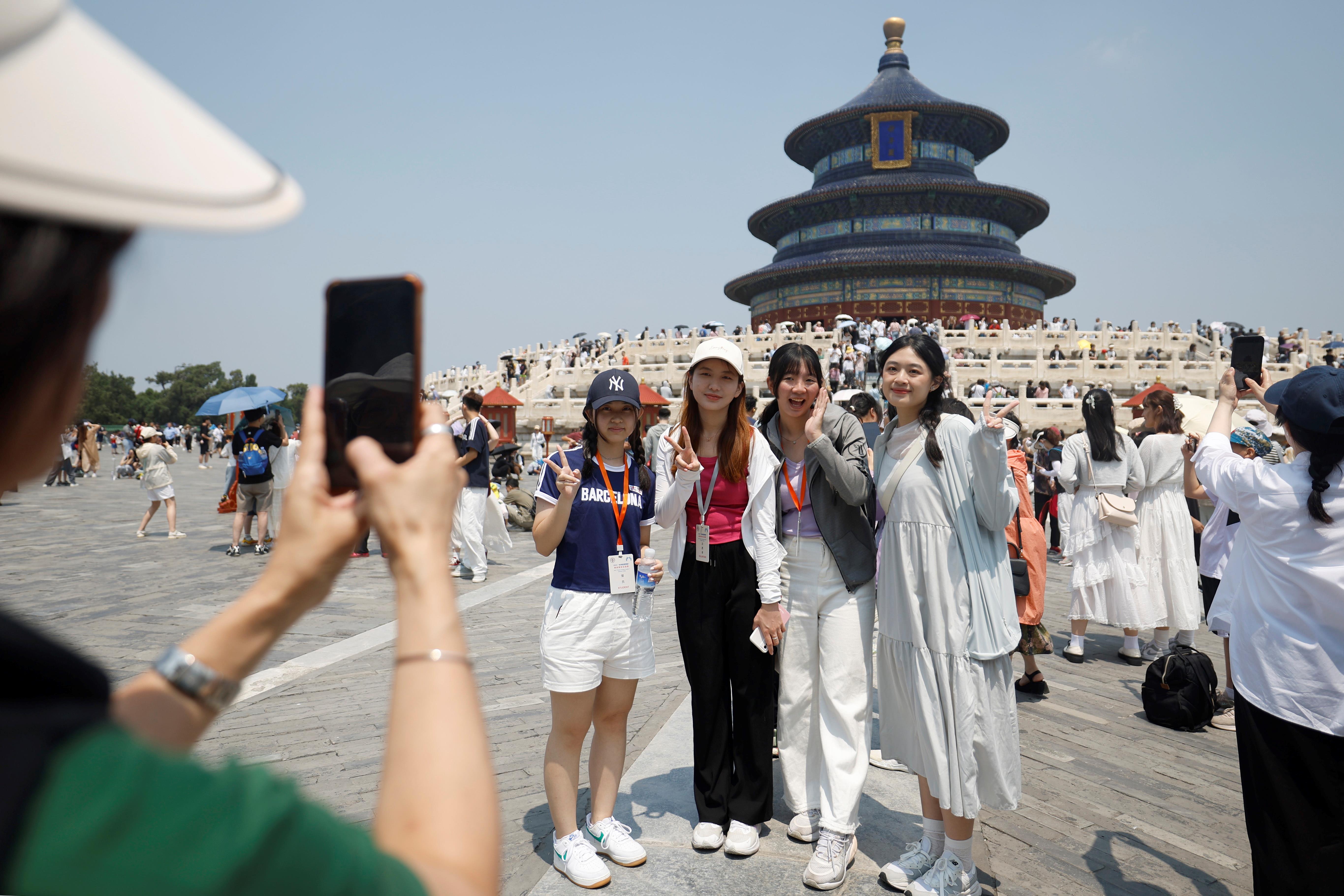 △2024年7月3日,臺(tái)灣青年在天壇公園拍照留念。當(dāng)日,2024“未來能源領(lǐng)袖”兩岸青年交流營(yíng)的營(yíng)員參觀游覽北京的奧林匹克公園、天壇公園等地。