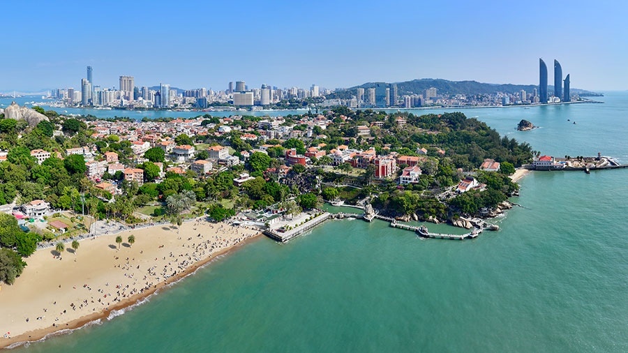 游人在廈門鼓浪嶼沙灘上游玩(無人機(jī)照片)。新華社記者 姜克紅 攝