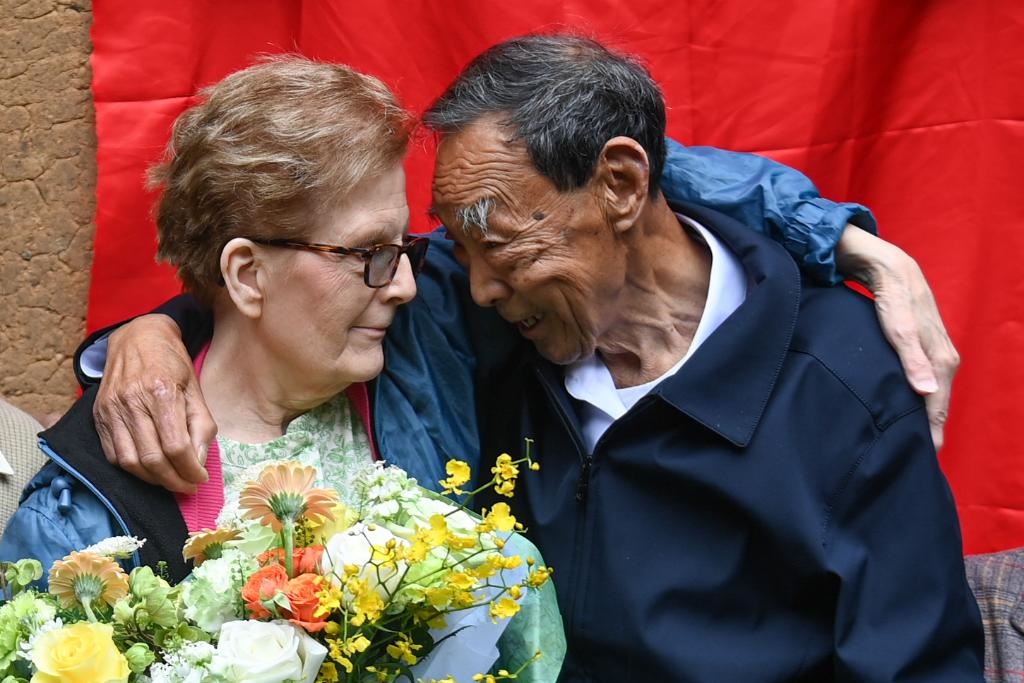 2024年4月17日,在浙江衢州江山市張村鄉(xiāng)龍頭店村,“杜立特行動(dòng)”3號(hào)機(jī)領(lǐng)航員查爾斯·奧祖克的女兒蘇珊·奧祖克(左)與村民廖明發(fā)相擁。1942年,村民廖詩(shī)原(廖明發(fā)的父親)一家曾悉心照顧跳傘降落的查爾斯·奧祖克。新華社記者 黃宗治 攝
