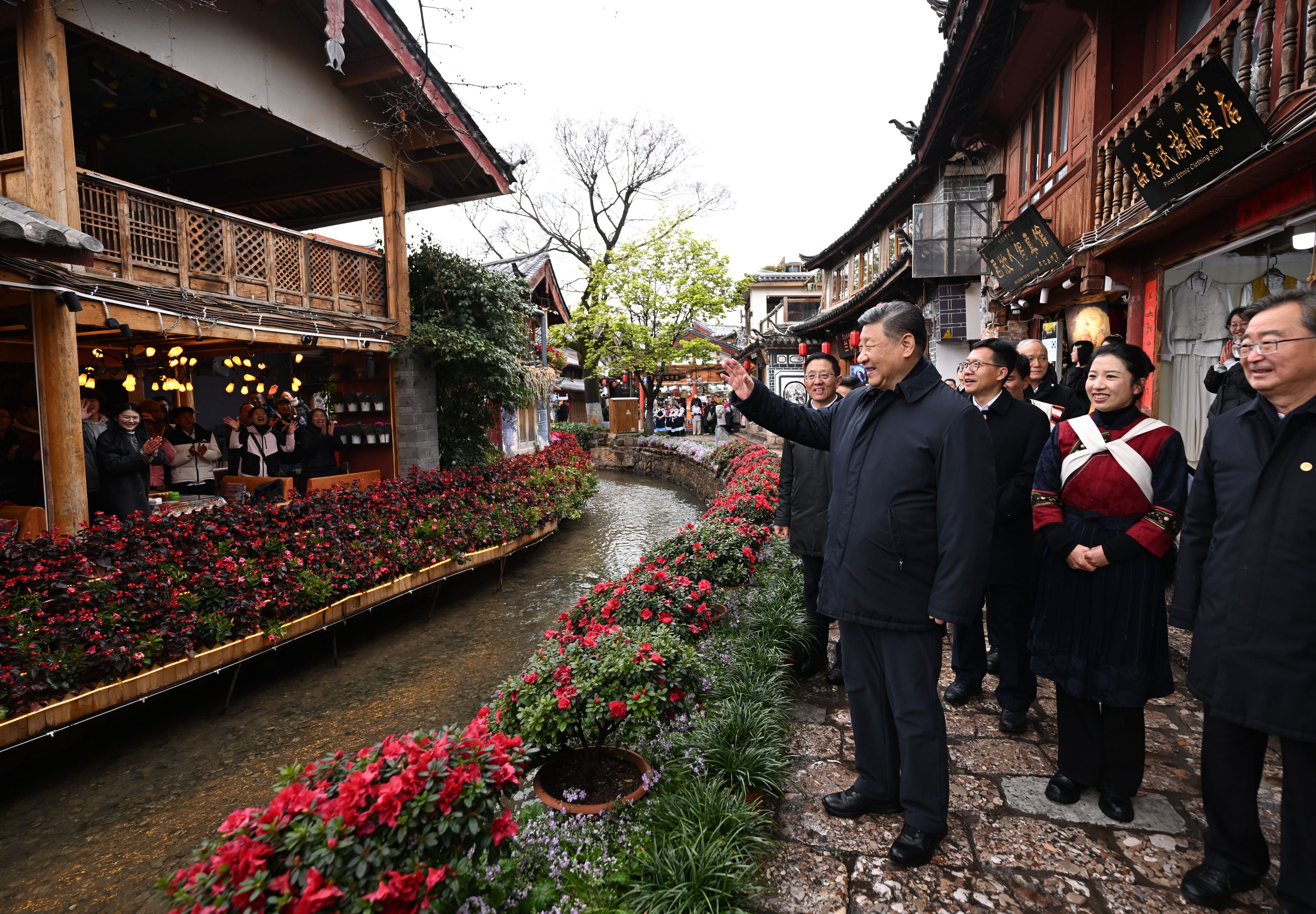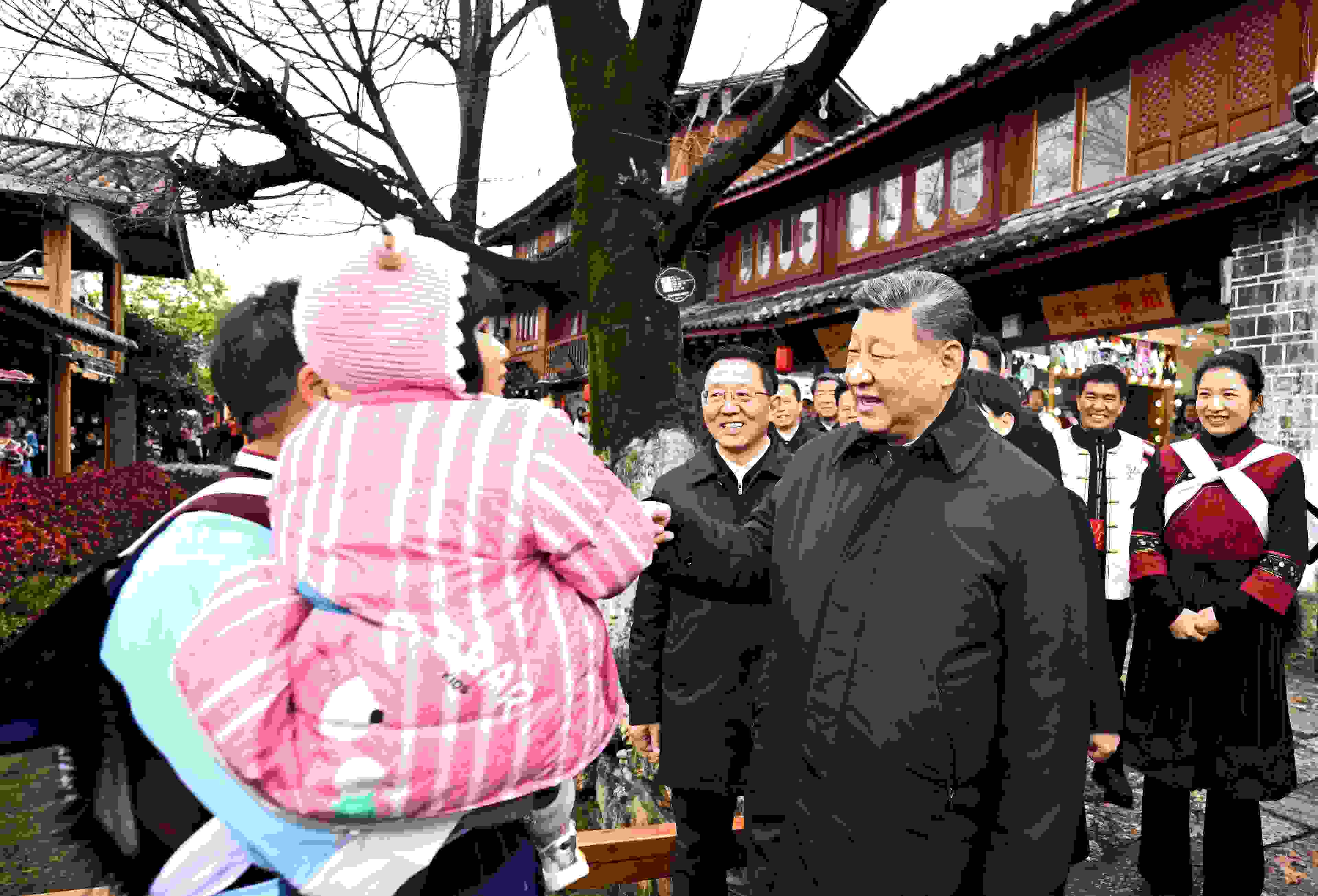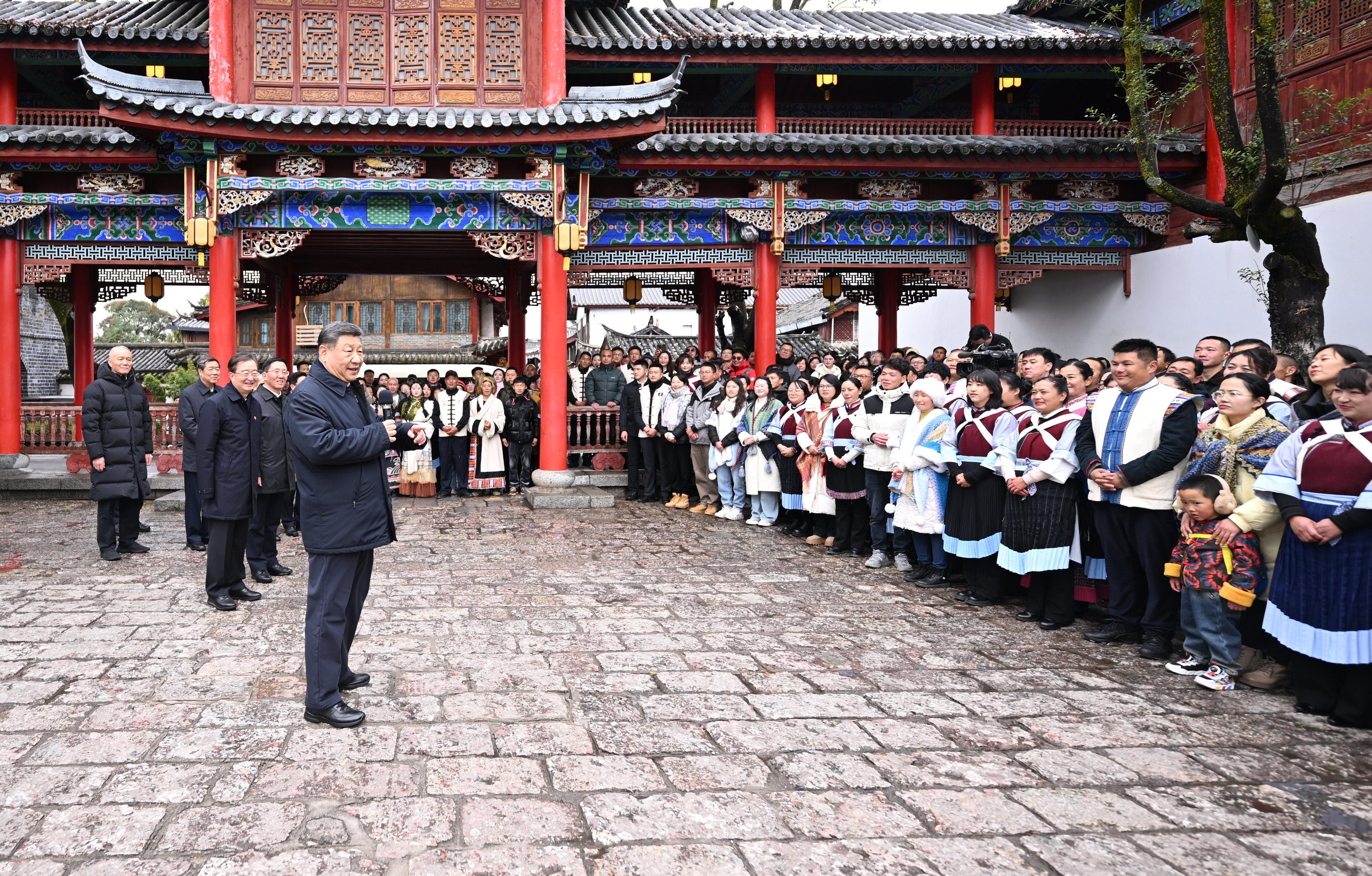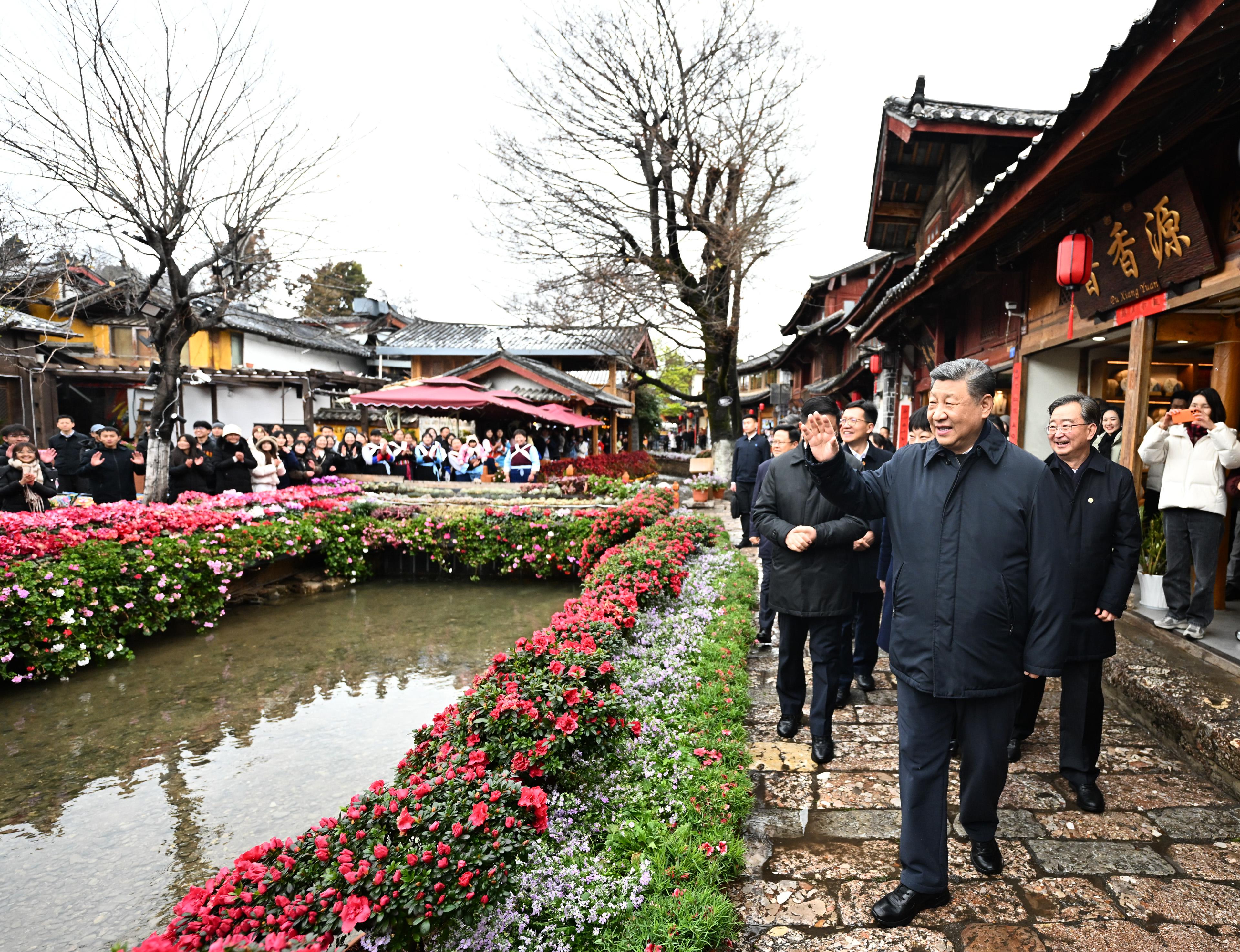 習近平總書記19日下午來到云南麗江古城,沿著石板路邊走邊看。當?shù)鼐用窈脱赝居慰褪譄崆榈叵蚩倳泦柡?,習近平不時停下腳步同大家親切交流。習近平說,這里的文化、風光、民俗都非常吸引人,文旅融合促進了經濟發(fā)展。文旅產業(yè)要走一條持續(xù)、健康的發(fā)展之路。希望你們的生活幸福安康,就像納西族的大姓“和”姓一樣,和和美美。