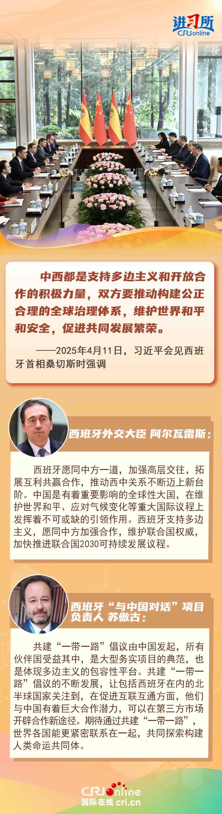 4月11日,中國(guó)國(guó)家主席習(xí)近平在北京會(huì)見(jiàn)來(lái)華訪問(wèn)的西班牙首相桑切斯時(shí)表示,中西友好是兩國(guó)人民基于傳統(tǒng)友誼、現(xiàn)實(shí)需要、長(zhǎng)遠(yuǎn)利益作出的正確抉擇,中西都是支持多邊主義和開(kāi)放合作的積極力量,雙方要推動(dòng)構(gòu)建公正合理的全球治理體系,維護(hù)世界和平和安全,促進(jìn)共同發(fā)展繁榮。