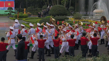 軍樂團奏中越兩國國歌,鳴禮炮21響。