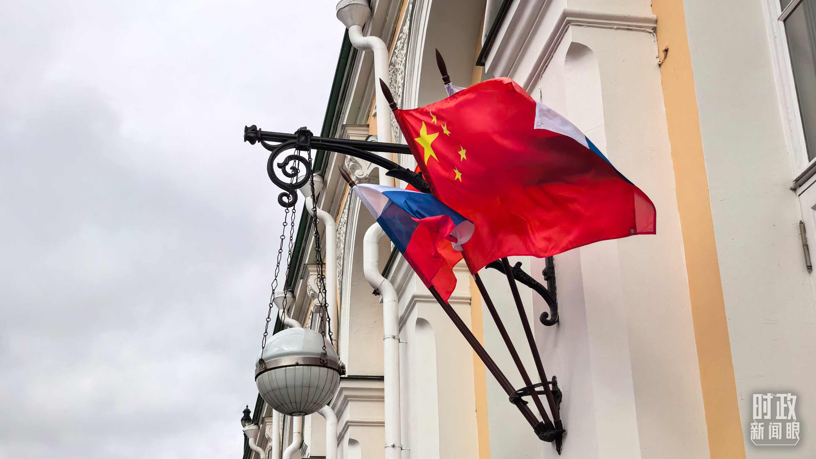 △下車處懸掛的中俄兩國國旗。(總臺央視記者劉琦拍攝)