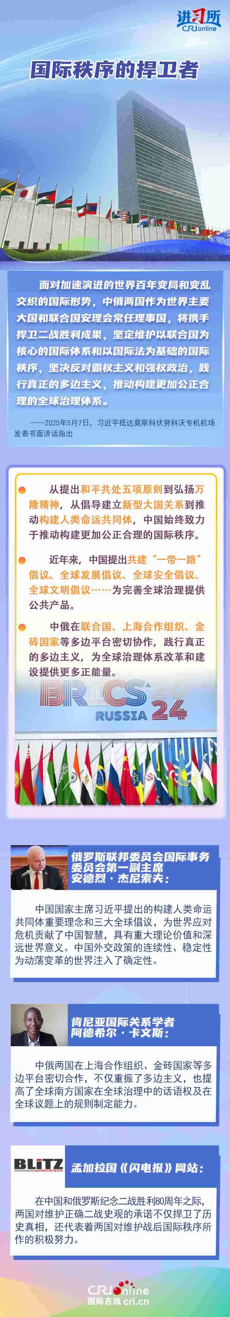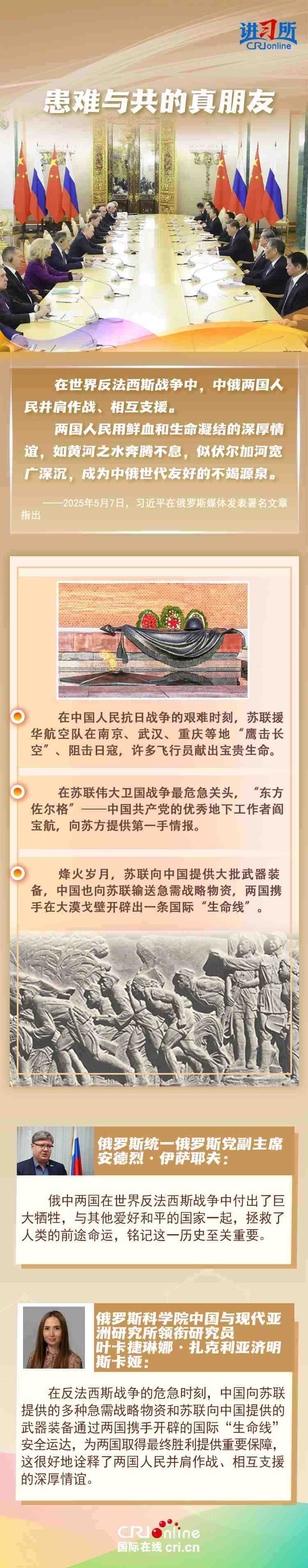 “兩國(guó)人民用鮮血和生命凝結(jié)的深厚情誼,如黃河之水奔騰不息,似伏爾加河寬廣深沉,成為中俄世代友好的不竭源泉?!苯衲晔侵袊?guó)人民抗日戰(zhàn)爭(zhēng)、蘇聯(lián)偉大衛(wèi)國(guó)戰(zhàn)爭(zhēng)暨世界反法西斯戰(zhàn)爭(zhēng)勝利80周年,也是聯(lián)合國(guó)成立80周年。在這一重要?dú)v史時(shí)間節(jié)點(diǎn),習(xí)近平主席此訪不僅為中俄關(guān)系發(fā)展注入強(qiáng)勁動(dòng)力,也向世界宣示中俄兩國(guó)攜手捍衛(wèi)二戰(zhàn)勝利成果的堅(jiān)定意志。