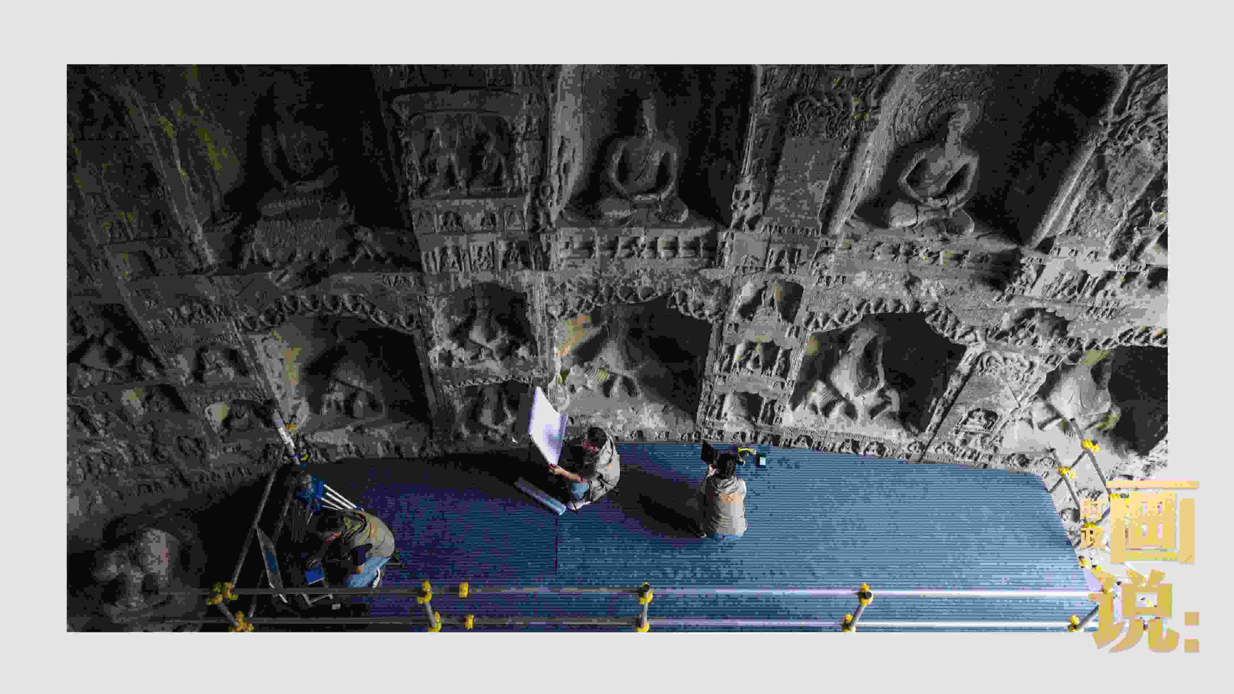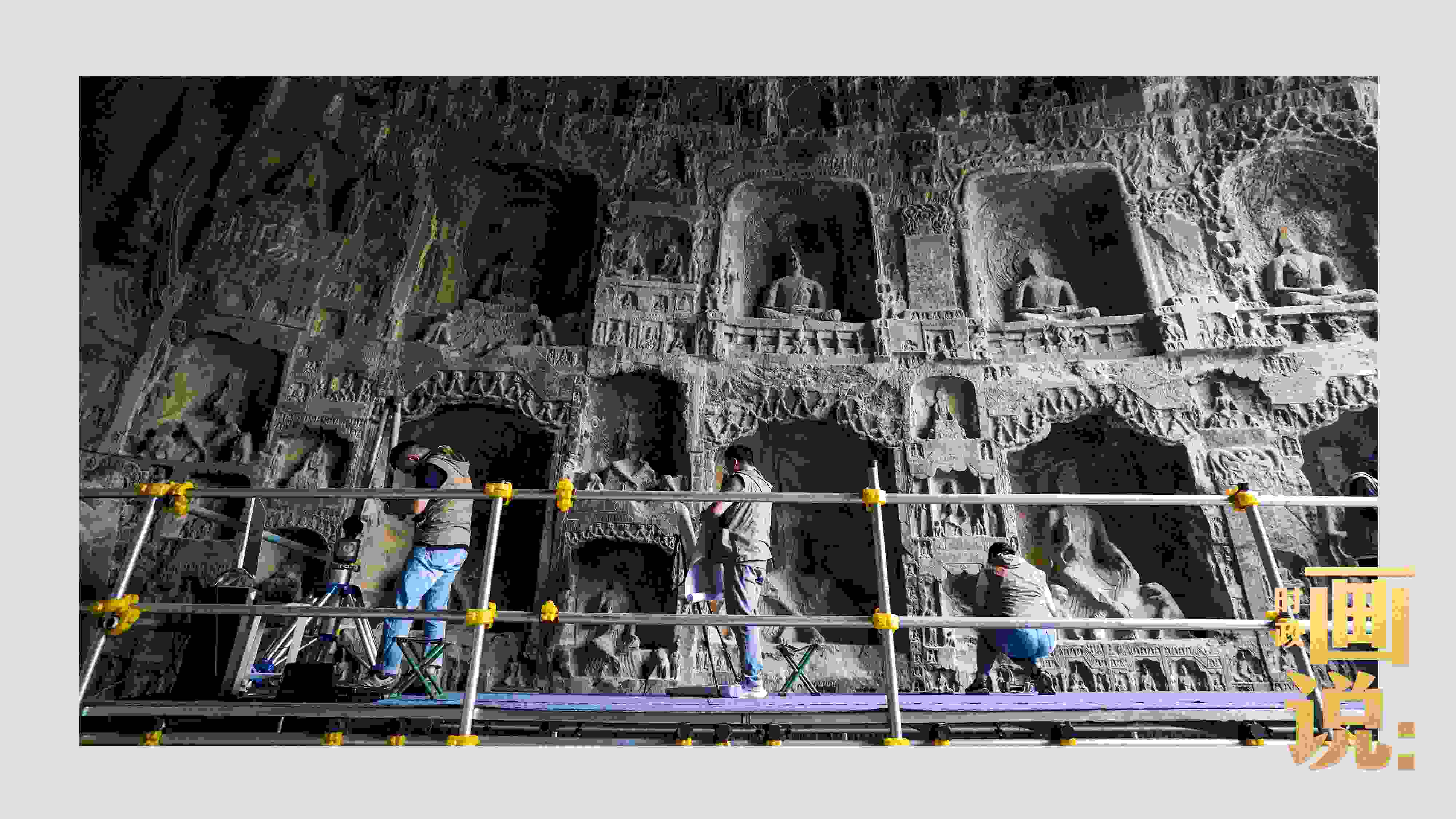△龍門石窟研究院工作人員在古陽洞使用關節(jié)臂掃描儀對佛像進行數字化掃描
