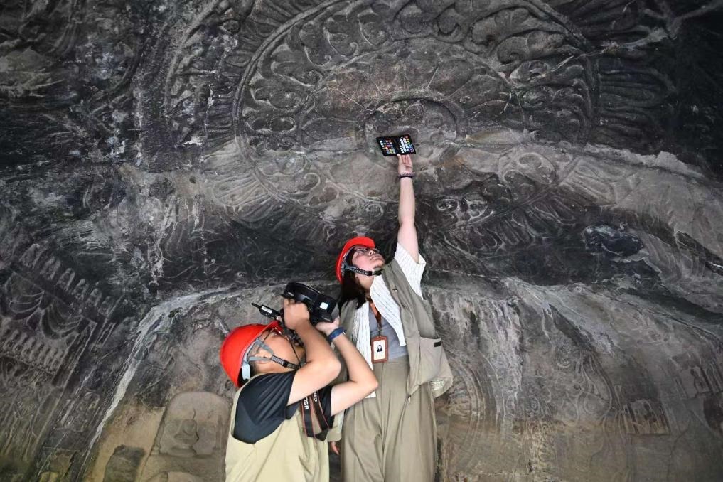 4月10日,龍門石窟研究院工作人員(右)與武漢大學(xué)文化遺產(chǎn)智能計算實(shí)驗(yàn)室團(tuán)隊(duì)成員一同對龍門石窟魏字洞進(jìn)行高清攝影掃描。新華社記者 李嘉南 攝