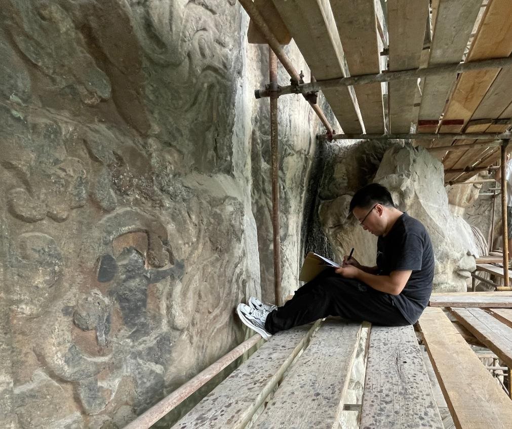 習(xí)近平總書記來到龍門石窟時,龍門石窟研究院考古研究中心工作人員谷宏耀正和其他部門同事共同對石窟進(jìn)行調(diào)查記錄。