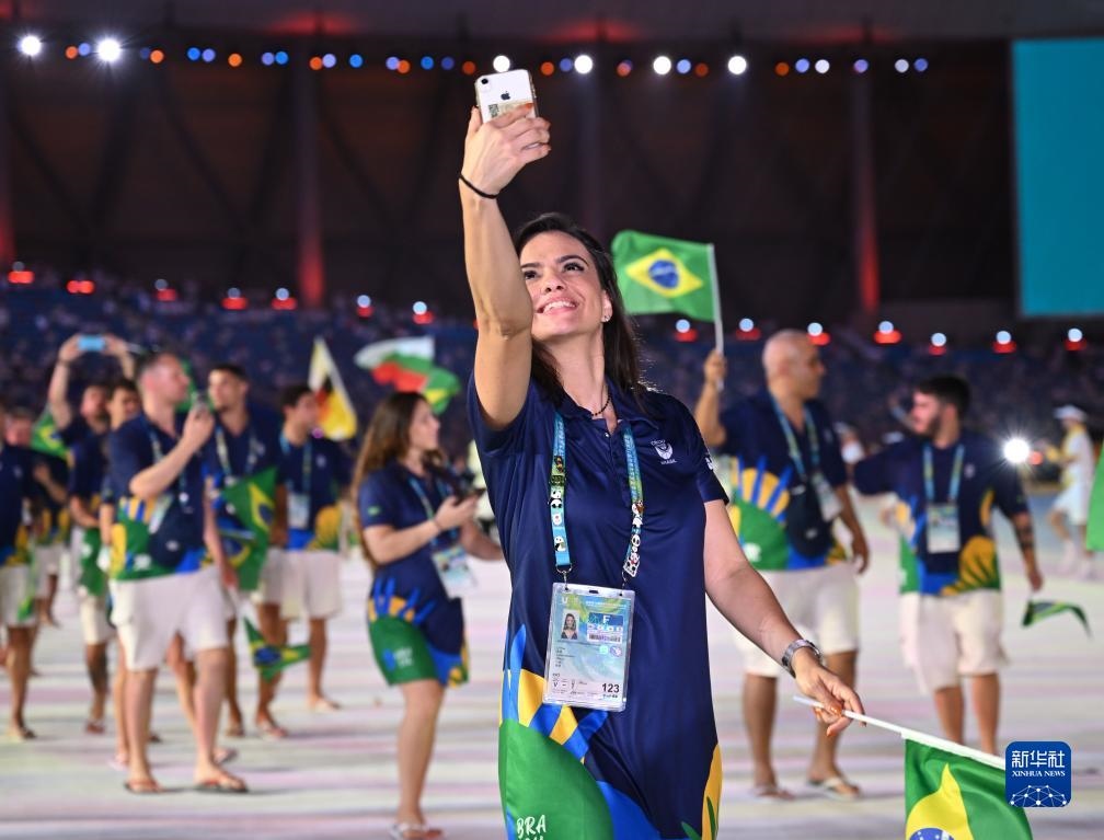 7月28日,巴西大學(xué)生體育代表團在開幕式上入場。