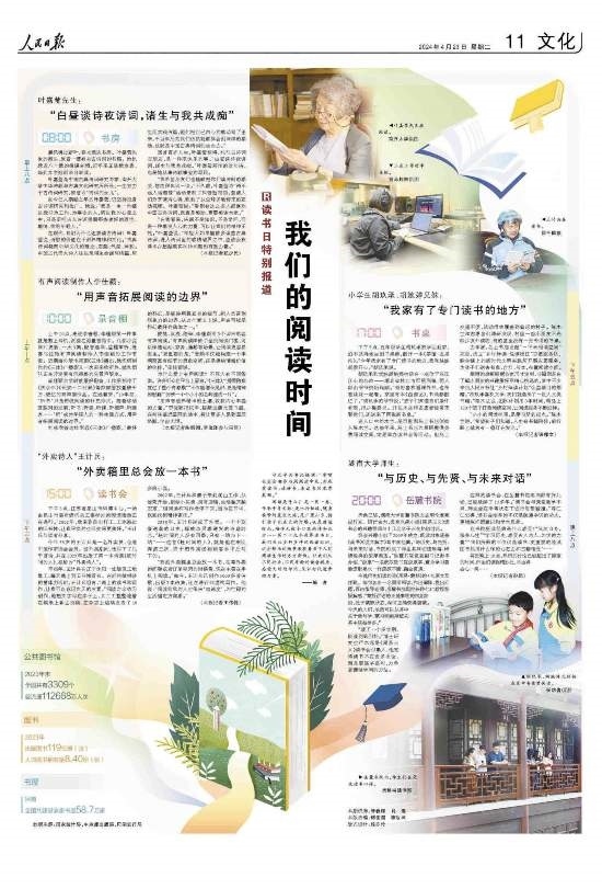 閱讀是什么?是一頁一卷,傳承千年文脈;是出行忙碌,隨身攜帶的星辰大海;是廣袤山鄉(xiāng),指引孩子們成長的燈塔;也是靜謐時(shí)光,陪伴無數(shù)個(gè)日夜的詩和遠(yuǎn)方……第二十九個(gè)世界讀書日,我們關(guān)注多種多樣的閱讀時(shí)間,這些鮮活的場(chǎng)景展現(xiàn)著當(dāng)下人們閱讀生活的方方面面。讓我們從不同行業(yè)、不同年齡的讀者視角,感受文明的印記,見證時(shí)代進(jìn)步的力量。