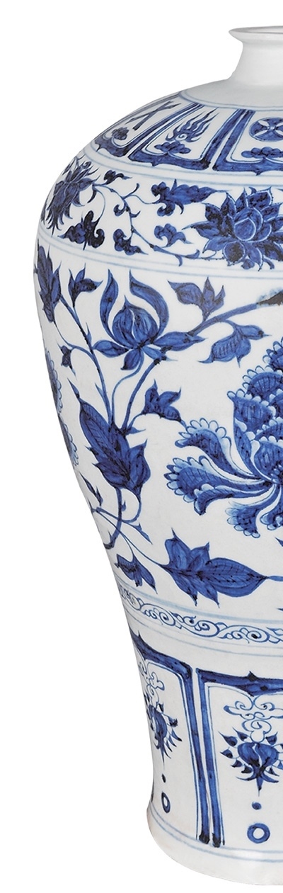 “元代的景德鎮(zhèn)制瓷匠從波斯進口‘蘇麻離青’,也就是鈷藍料,經(jīng)高溫?zé)坪蟪尸F(xiàn)出了青花的典型色調(diào)?!别^長彭國紅靠近展柜,指著梅瓶說道:“青花料濃厚處有黑褐色鐵銹瑕疵,是因為這種原料中含有金屬元素,這是元代青花制品的特點之一?!?/p>