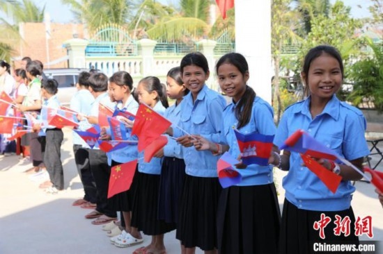 1月19日,“絲路心相通”春節(jié)文化交流活動在茶膠省中柬友好扶貧示范村達弄村活動中心舉辦,學生們在道路旁舉旗歡迎。項薪宇 攝