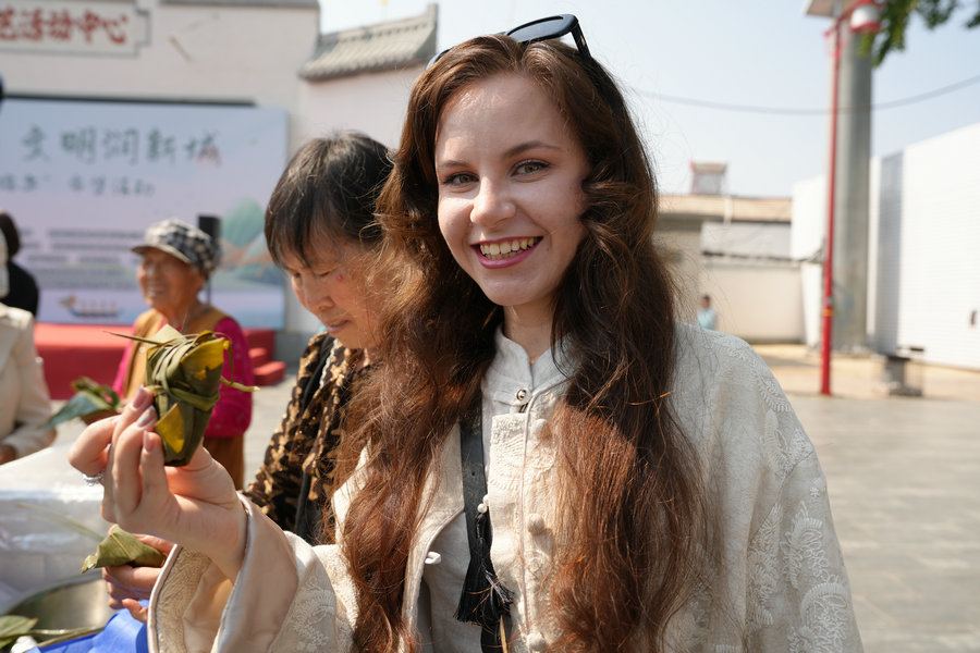 活動(dòng)現(xiàn)場(chǎng),粽香四溢,歡聲笑語此起彼伏。大家圍在一起,捋粽葉、填糯米、扎絲線,共同體驗(yàn)包粽子的傳統(tǒng)習(xí)俗。手法嫻熟的村民手把手教授外國(guó)友人包粽子的技巧,不一會(huì)兒,一個(gè)個(gè)形態(tài)各異的粽子便擺滿了桌。來自烏克蘭的留學(xué)生安吉麗娜學(xué)得格外認(rèn)真,她一邊模仿著村民的動(dòng)作,一邊忍不住贊嘆:“喜歡包粽子,粽子好吃!”言語間滿是對(duì)中國(guó)傳統(tǒng)美食的喜愛。