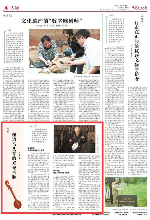 2025年7月14日《中國(guó)文化報(bào)》第4版刊發(fā)了題為《布林:厘清馬頭琴的來(lái)龍去脈》的文章,報(bào)道了做為非物質(zhì)文化遺產(chǎn)項(xiàng)目蒙古族馬頭琴音樂代表性傳承人的布林立足民間傳說的同時(shí)又埋頭于各種典籍。他說作為代表性傳承人,有必要更有責(zé)任將馬頭琴的來(lái)龍去脈說清楚,對(duì)歷史、對(duì)未來(lái)都有個(gè)交代。