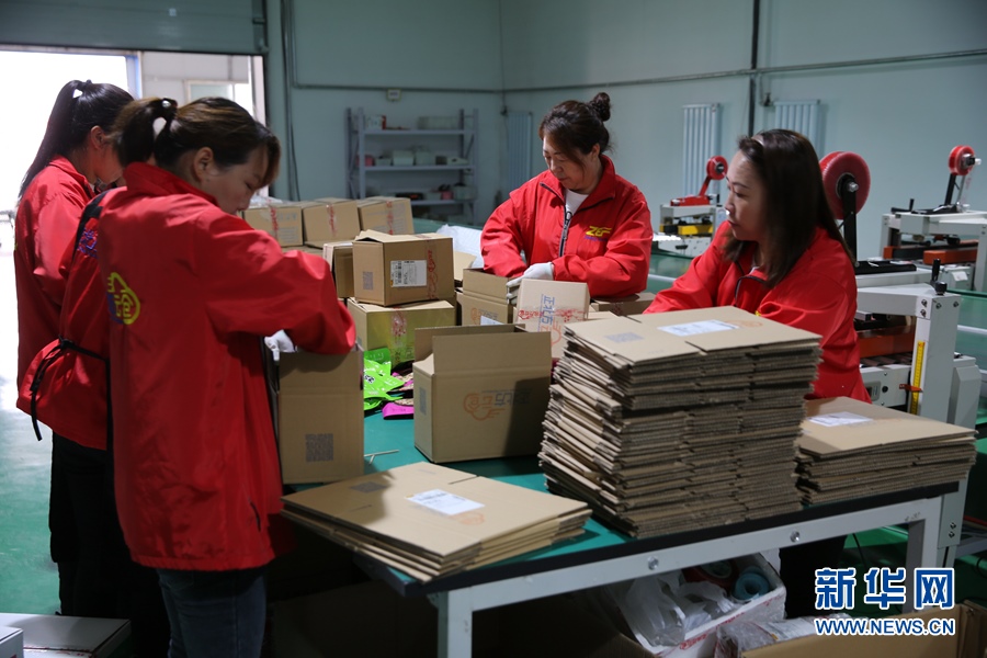 在賽罕區(qū)金河鎮(zhèn)曙光村“正北方云倉(cāng)”電商平臺(tái)打包車間,工作人員正在分貨裝箱。新華網(wǎng) 石毅 攝