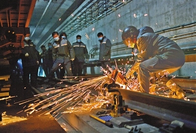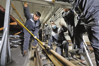 昏暗、逼仄的軌行區(qū)內,軌道檢修師們焊接鋼軌時迸發(fā)的火花顯得格外耀眼,維修軌道設備時敲擊鋼軌的聲音顯得格外清脆、響亮。據(jù)田智宏介紹,一個軌道檢修師每次夜間軌行區(qū)的巡檢作業(yè)大約要走7公里路程。他和工友們每天要檢查數(shù)千個部件,測量上百個數(shù)據(jù),其中一項重要巡檢工作就是檢查扣件和接頭聯(lián)結零件的組成部件是否安裝牢固,螺栓是否松動。他指了指自己腳上的鞋說:“我們的檢修對象不僅笨重且危險性較高,為了防止腳部受到傷害,鞋子都是特制的防砸絕緣鞋。”