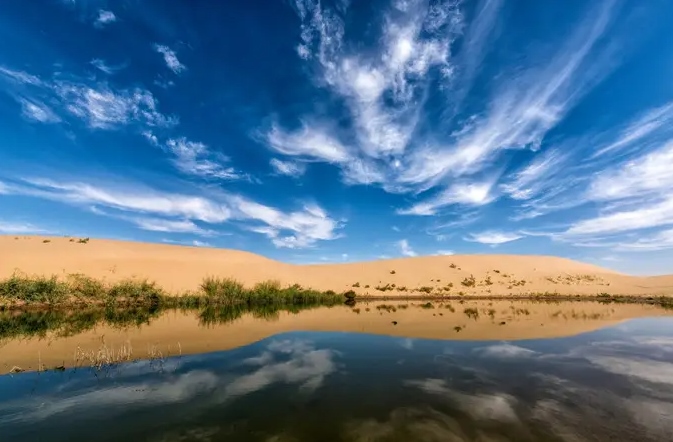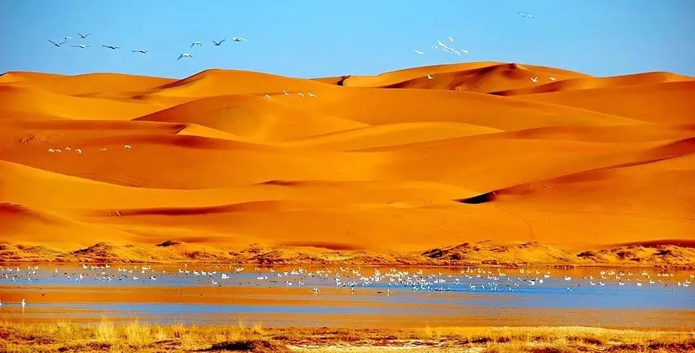 巴丹吉林沙漠年降水量不足40毫米,但是沙漠中的湖泊竟然多達(dá)100多個(gè)。高聳入云的沙山,神秘莫測的鳴沙,靜謐的湖泊、濕地,構(gòu)成了巴丹吉林沙漠獨(dú)特的迷人景觀,于2005年被《中國國家地理》雜志評為中國最美麗的沙漠,每年吸引了上萬名國內(nèi)外游客前來觀光。