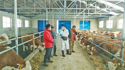 興安盟科技特派員王強(右二)對養(yǎng)殖戶進行現(xiàn)場指導(dǎo)。