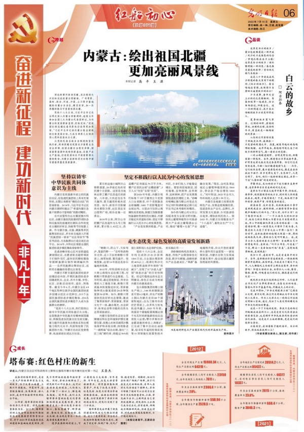 7月15日,《光明日報》6版刊發(fā)《奮進(jìn)新征程建功新時代·非凡十年|內(nèi)蒙古:繪出祖國北疆更加亮麗風(fēng)景線》,全文如下: