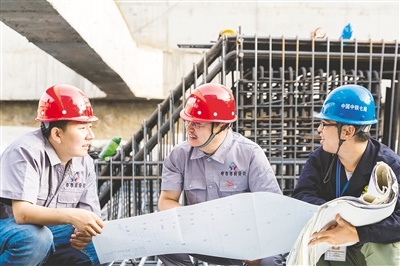 韓佳彤(中)在施工現(xiàn)場(chǎng)為團(tuán)隊(duì)人員指導(dǎo)工作。