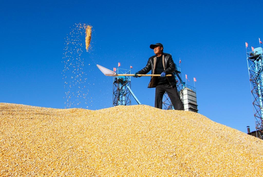 10月18日,在奈曼旗新鎮(zhèn)舍布日圖嘎查的一家收糧站,一名工人在晾曬玉米。(新華社記者連振 攝)