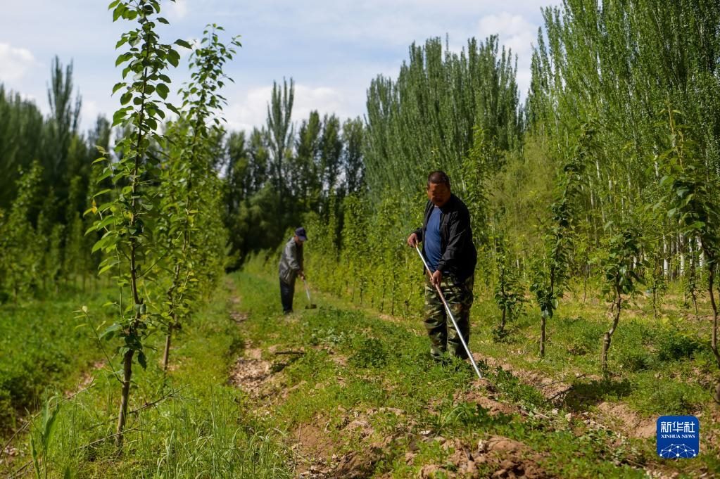 6月5日,臨河區(qū)國營新華林場工人在管護(hù)林木。新華社記者 李志鵬 攝