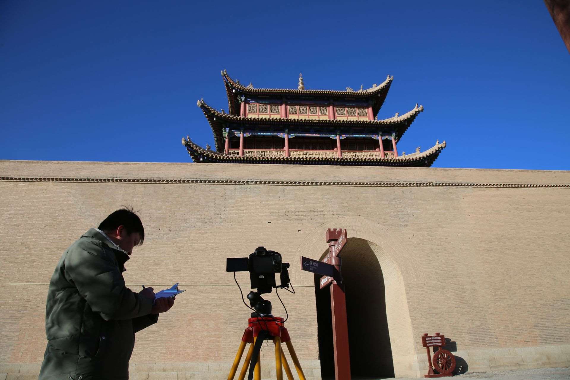 1月29日,嘉峪關(guān)絲路(長城)文化研究院文化遺產(chǎn)監(jiān)測中心工作人員高商,正在對柔遠(yuǎn)樓城臺裂縫進(jìn)行定期監(jiān)測。嘉峪關(guān)絲路(長城)文化研究院供圖