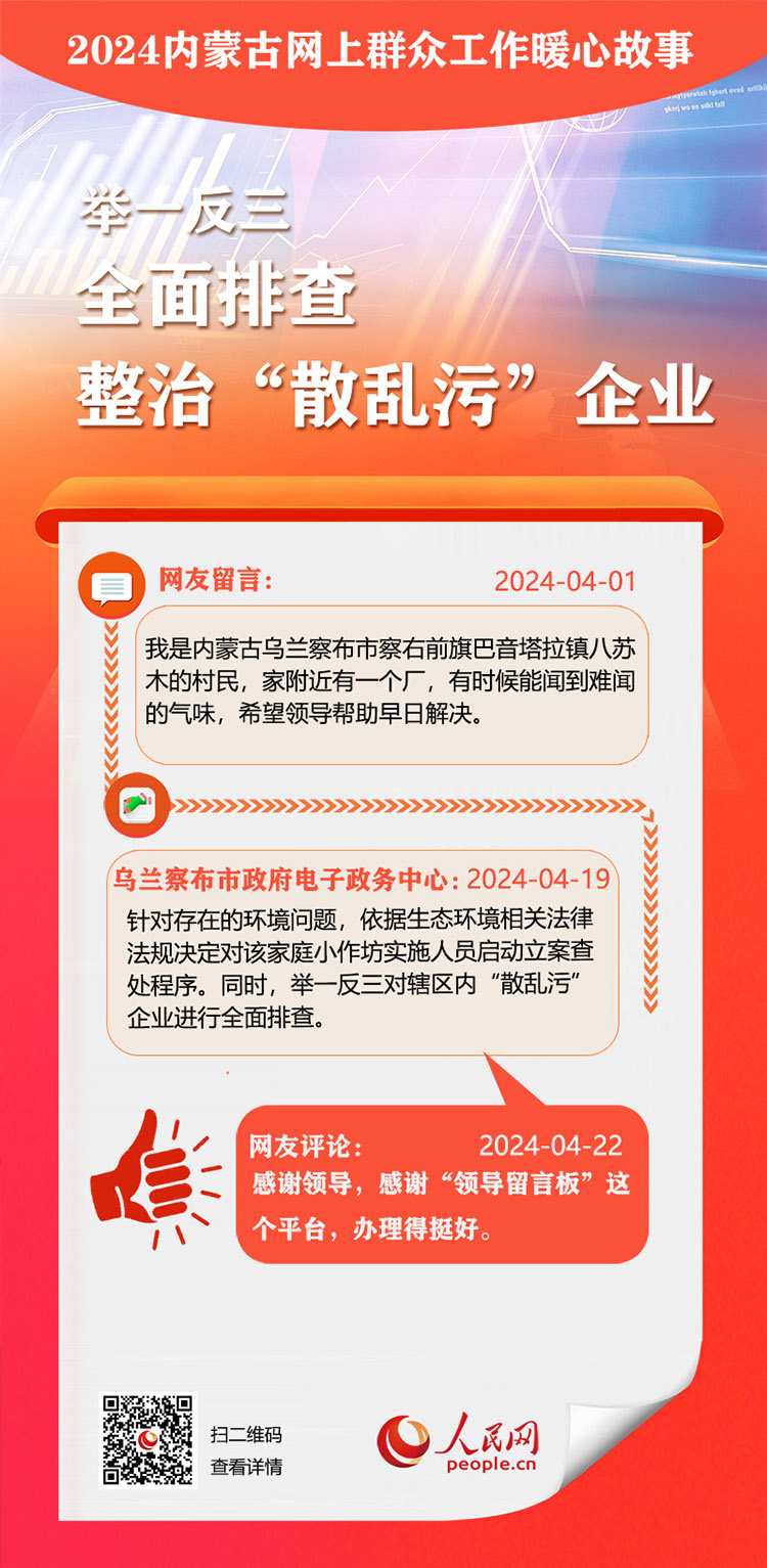 走好走實網(wǎng)上群眾路線 用心用情為民服務(wù)辦實事。依托人民網(wǎng)“領(lǐng)導(dǎo)留言板”,內(nèi)蒙古自治區(qū)各級黨委、政府著力解決網(wǎng)民反映的熱點難點。2024年,一批群眾關(guān)切的急難愁盼問題得到及時解決。人民網(wǎng)內(nèi)蒙古頻道推出特別策劃,盤點過去一年內(nèi)蒙古網(wǎng)上群眾工作那些暖心事。