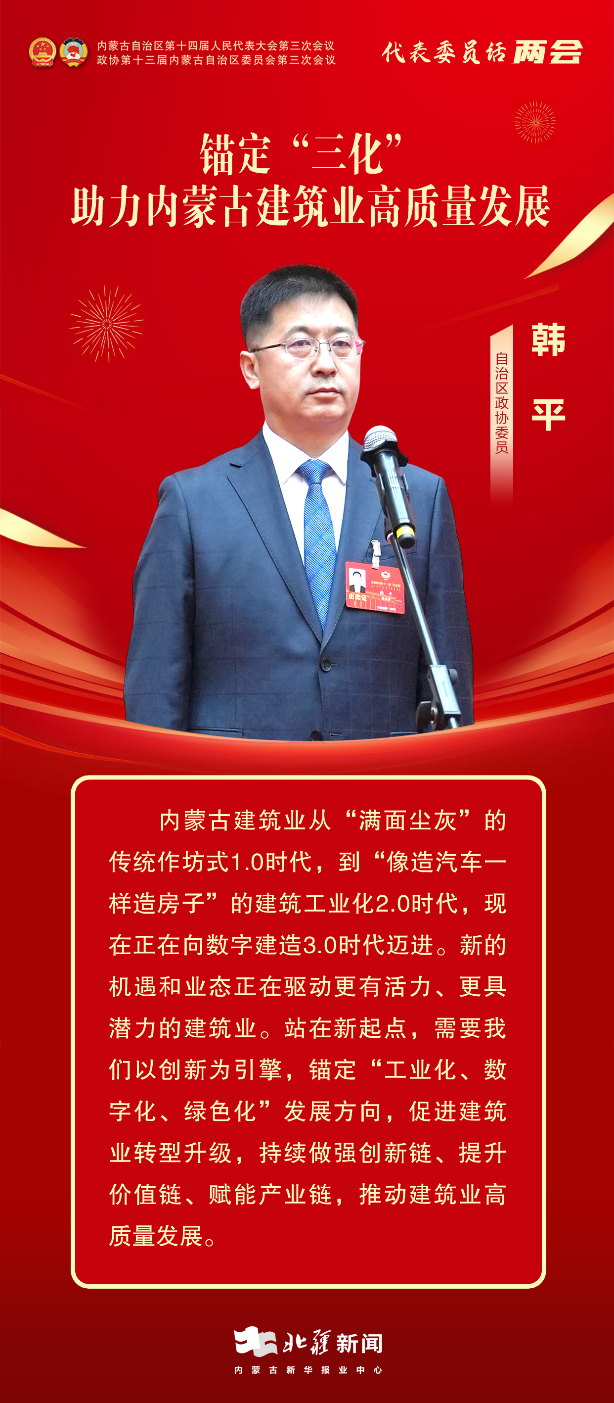 北疆新聞呼和浩特1月13日電(記者 張鑫 李姝廷)委員通道,通民心、道發(fā)展。1月13日上午,自治區(qū)兩會首場“委員通道”正式開啟。自治區(qū)政協(xié)委員,興泰建設(shè)集團(tuán)有限公司黨委書記、董事長韓平圍繞“建筑業(yè)高質(zhì)量發(fā)展”的內(nèi)容建真言、獻(xiàn)良策。